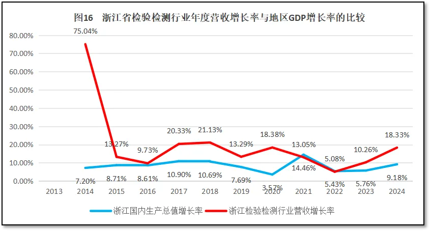 浙江省GDP年度增长曲线与浙江省检验检测机构年度营收总额增长曲线的比较,如图16所示。