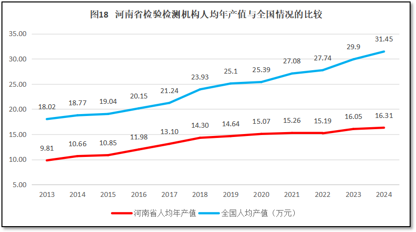 河南省检验检测机构人均年产值与全国的情况比较,如图18所示。