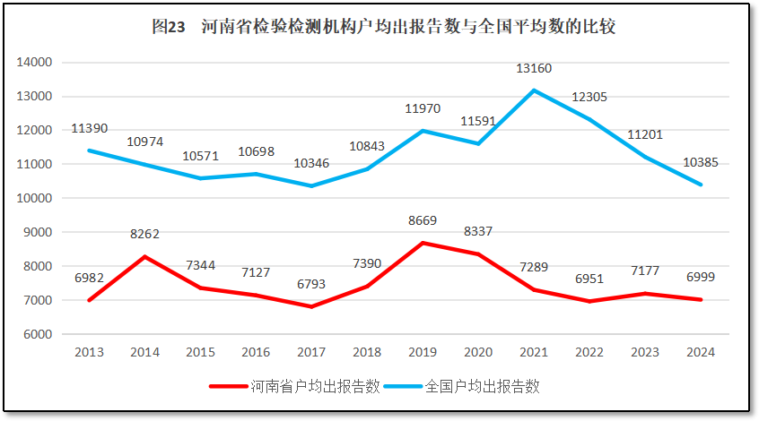 2024年度,河南省检验检测机构户均出具检验检测报告6999份,是全国平均水平10385份的67.4%,全国排名第17位,较2023年度排名提升3位。从2013年以来,河南省检验检测机构户均出具检验检测报告数量与全国的比较,如图23所示。