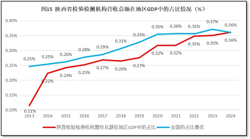 再来看陕西省检验检测机构营收总额在其地区生产总值GDP中的占比情况。2024年度,陕西省检验检测机构营收总额128.06亿元,占当年陕西省GDP值的0.36%,与全国平均值0.36%基本上一样,排名全国第13(由高到低排序),处于全国中等水平。过去12年陕西省检验检测机构营收总额在当地GDP值的比例变化情况,如图15所示。