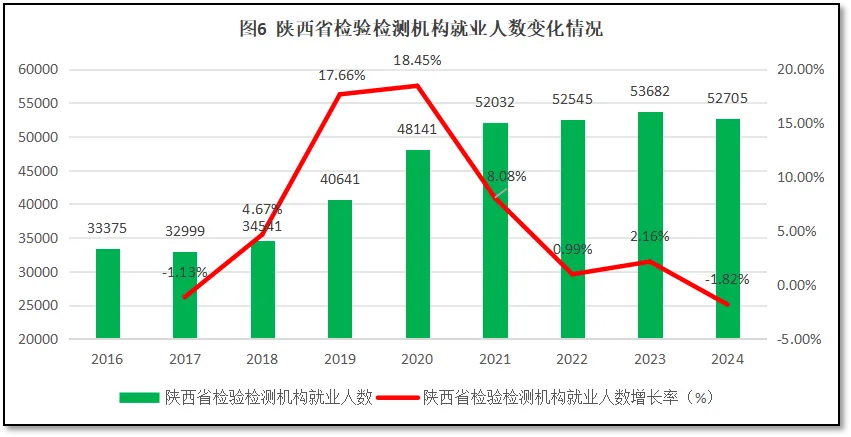 由图5可见,从2016年到2023年,陕西省检验检测机构就业人口数量总体保持增长,从2016年的3.3万人增长到2023年的5.37万人,年均增速7.27%。不过,2024年,陕西省检验检测机构就业人数出现轻微下降,但降幅不大。从增长率曲线看,陕西省检验检测机构就业人数增长率在2019-2020年出现一个比较高的增长峰值,此后逐年下降。2022年和2023年增长微乎其微,2024年增长率降到负值区间。