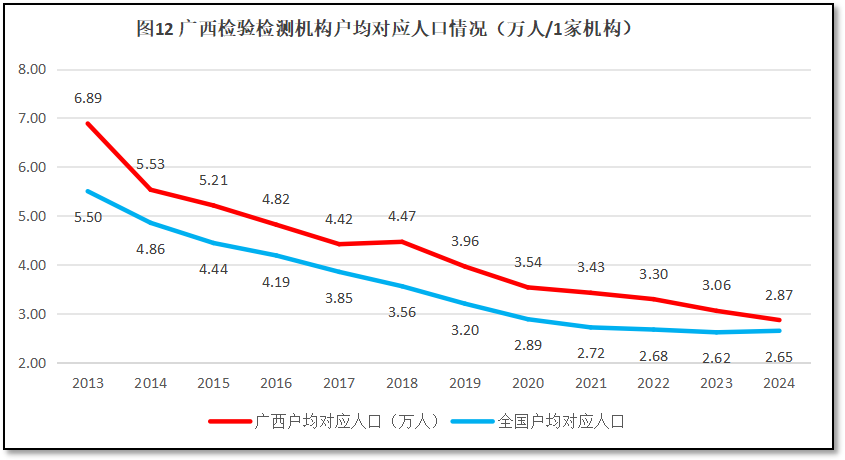 再来看广西壮族自治区地区检验检测机构户均对应服务的人口情况。2024年末,广西壮族自治区常住人口5013万人,检验检测机构户均服务人口2.87万人,比全国平均数2.65万人高出2200人,排名全国第10位,较2023年度排名下降2位。相对于广西壮族自治区人口数量来说,当地的检验检测机构数量不算太多,但随着广西检验检测机构数量的持续增加,这种情况也正在逐步改变。过去12年,广西壮族自治区检验检测机构户均对应的人口数量与全国的情况进行比较,如图12所示。